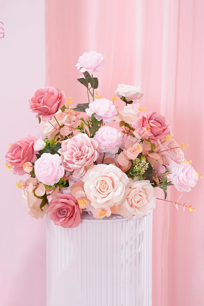 This romantic set of pink rose table centerpieces features roses, hydrangeas, and peonies arranged on a foam base. Inspired by spring gardens blooming in sunlight, the gentle pink tones symbolize first love, happiness, and sweetness.