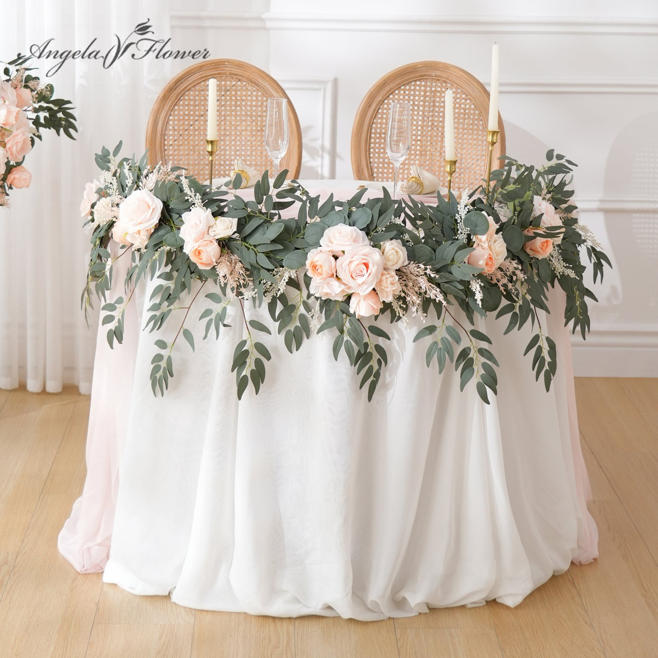 The soft pink tones paired with champagne accents create a romantic and elegant ambiance, perfect for weddings, parties, or home décor. Long‑lasting and easy to arrange, this garland adds sophistication and color to any setting.