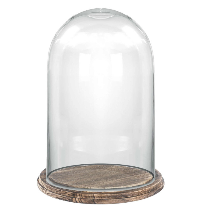 The Stylish Glass Dome with Wooden Base stands at 16 inches tall with an 11-inch diameter, offering a striking display piece for cherished items. Crafted from hand-blown clear glass paired with a rustic burnt Paulownia wood base, this dome combines natural warmth with elegant craftsmanship.