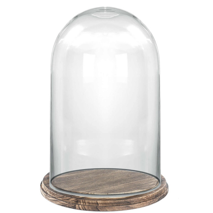 The Stylish Glass Dome with Wooden Base stands at 20.5 inches tall with a 13-inch diameter, offering a commanding display piece for cherished items. Crafted from hand-blown clear glass paired with a rustic burnt Paulownia wood base, this dome combines natural warmth with elegant craftsmanship.