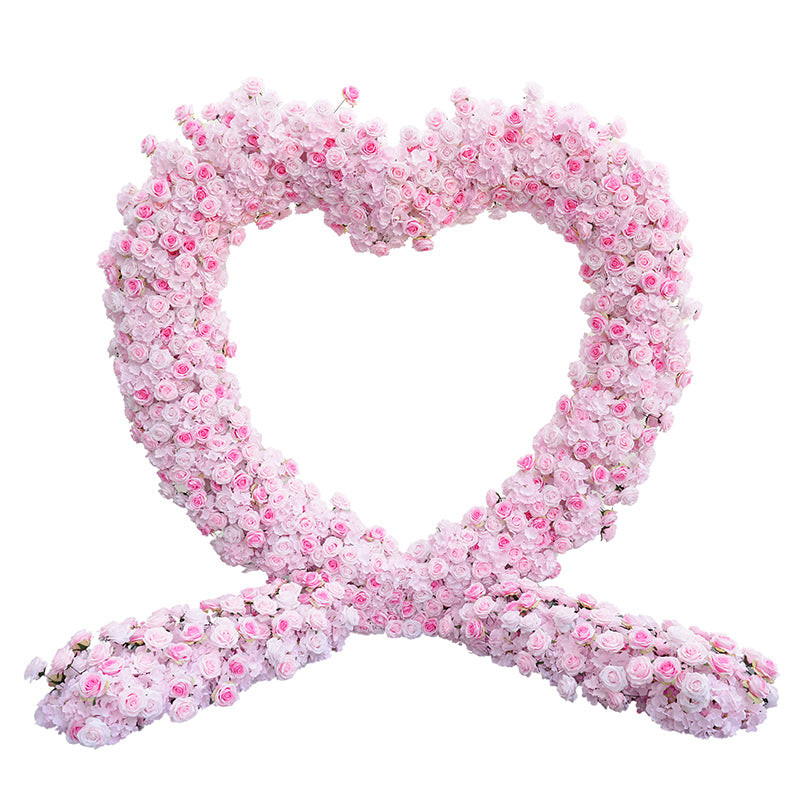 This luxury wedding arch features a heart‑shaped shelf design adorned with soft pink silk flowers. Supported by a sturdy metal frame, it offers multiple flower row options for flexible styling.